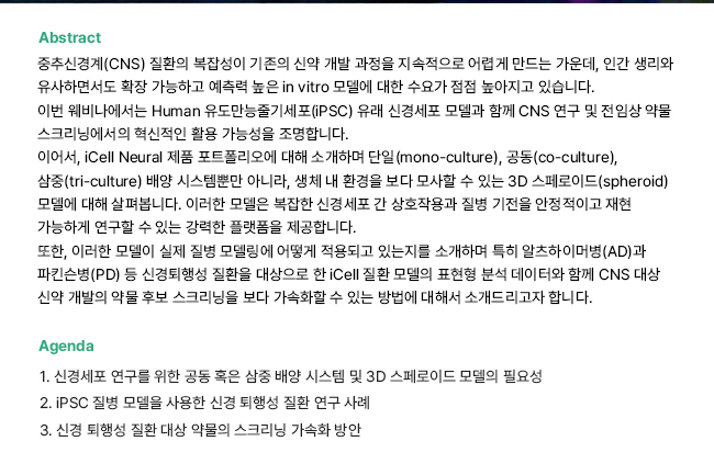 [웨비나] iPSC-유래 신경세포 모델을 활용한 질병 연구 및 신약개발 전략