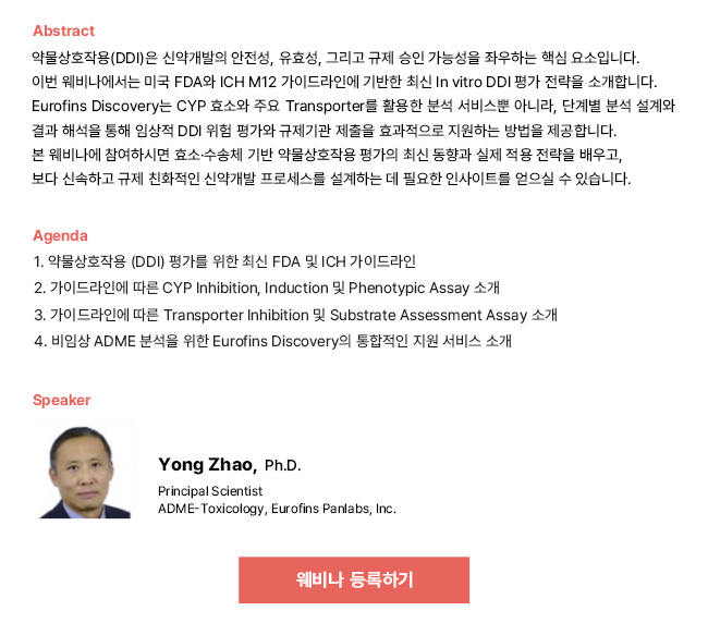 [신약개발 웨비나] FDA·ICH 가이드라인 기반 In vitro 약물상호작용(DDI) 평가 전략: CYP 효소 및 Transporter 중심 접근법 소개